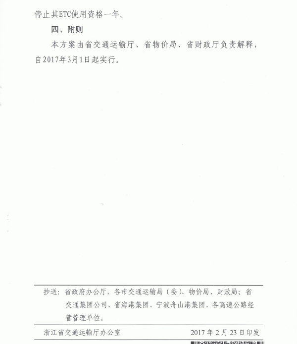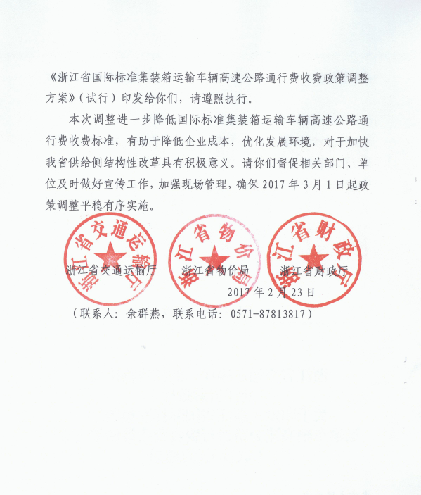 浙江省國(guó)際標(biāo)準(zhǔn)集裝箱運(yùn)輸車輛高速公路通行費(fèi)收費(fèi)政策調(diào)整方案(試行) 浙交[2017]23號(hào)