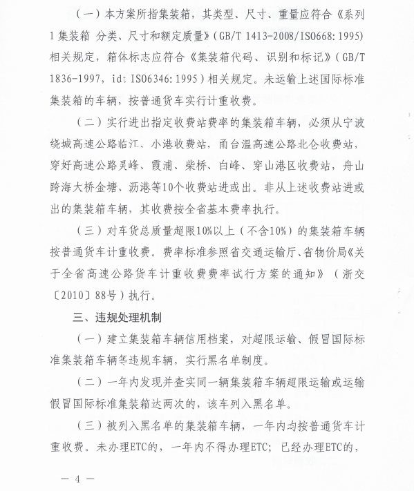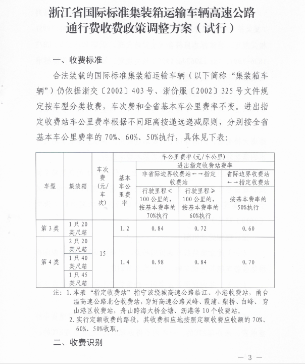 浙江省國(guó)際標(biāo)準(zhǔn)集裝箱運(yùn)輸車輛高速公路通行費(fèi)收費(fèi)政策調(diào)整方案(試行)