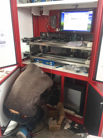 圖為工作人員正在對發(fā)卡機內(nèi)部進行接線