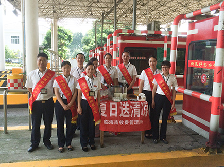 圖為工作人員合影 活動當天,該所在車道安全島內搭起臨時“便民服務臺”,不僅免費為司乘人員提供綠豆湯、礦泉水等消暑食品,還備足藿香正氣水、風油精、清涼油、花露水等解暑降溫藥品?;顒又?,大家身披橫幅,面帶微笑,向途經收費所的司機遞上一杯杯綠豆湯、一瓶瓶礦泉水。同時,大家還不忘宣傳行車安全注意事項,提醒司機朋友在高溫酷暑時節(jié)多注意安全。司機朋友們不時露出欣喜的笑容,連連稱謝。 臨海南收費所通過開展“夏日送清涼”活動,不僅給廣大司乘人員在酷暑中送去絲絲涼意和關心,更加促進了收費員與司乘人員之間的溝通交流,拉近距離,從而贏得了過往司乘人員的好評,塑造了良好的窗口形象。 陳瑩