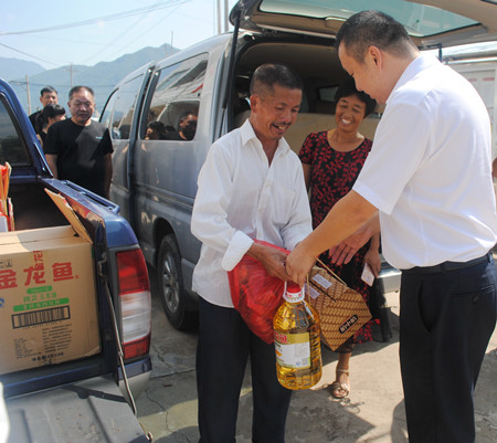 圖為臺(tái)州收費(fèi)所黨支部書記王小勇給困難戶送上慰問(wèn)品