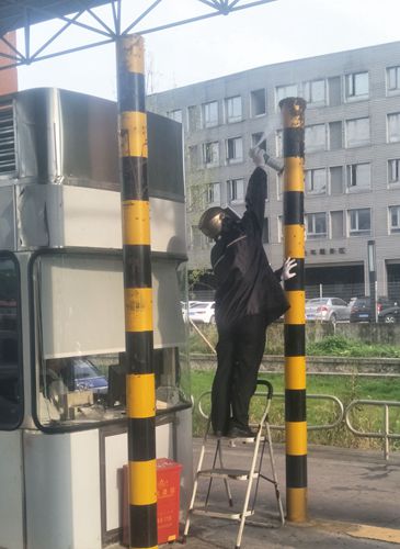 圖為工作人員用殺蟲劑噴射蜜蜂 當(dāng)班副班長何丹燕立即將車道內(nèi)情況報(bào)告給所領(lǐng)導(dǎo),副所長何先林聽聞后急急披上雨衣,戴上頭盔和手套,迅速趕到車道,經(jīng)過簡單防護(hù)的他用殺蟲劑噴射蜜蜂集聚的位置。與此同時(shí),何丹燕疏導(dǎo)后方車輛從其他車道通行。