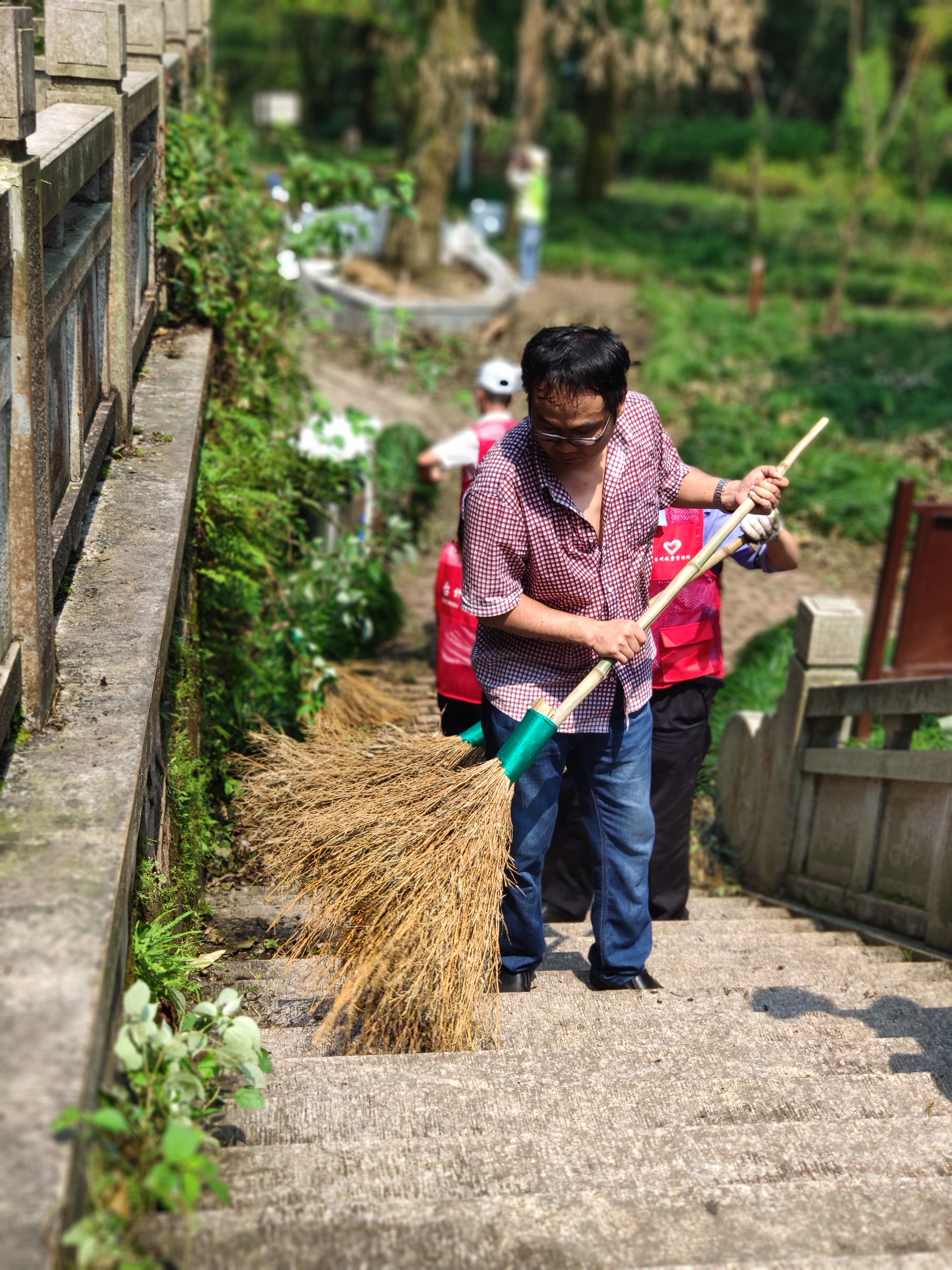 上午8點半左右,志愿者們帶著掃把、鐵鍬等工具到達九峰公園,在黃巖青年志愿者的帶領(lǐng)下,來到劃分的平臺區(qū)塊。受9號臺風(fēng)“利奇馬”影響,公園內(nèi)不少樹木倒地,枯葉遍地。志愿者們帶著手套,用掃把、鐵鍬將平臺區(qū)域內(nèi)堆積的落葉和樹枝進行裝袋清理。小的樹枝用草繩捆扎;拿不動的樹枝,用鋸子鋸斷了抬走;鐵鍬不好裝袋,就用手去捧。烈日酷暑下,志愿者們不顧汗流浹背,經(jīng)過兩個多小時的努力,共清理出40多袋垃圾,大家用雙手還公園一片美。
