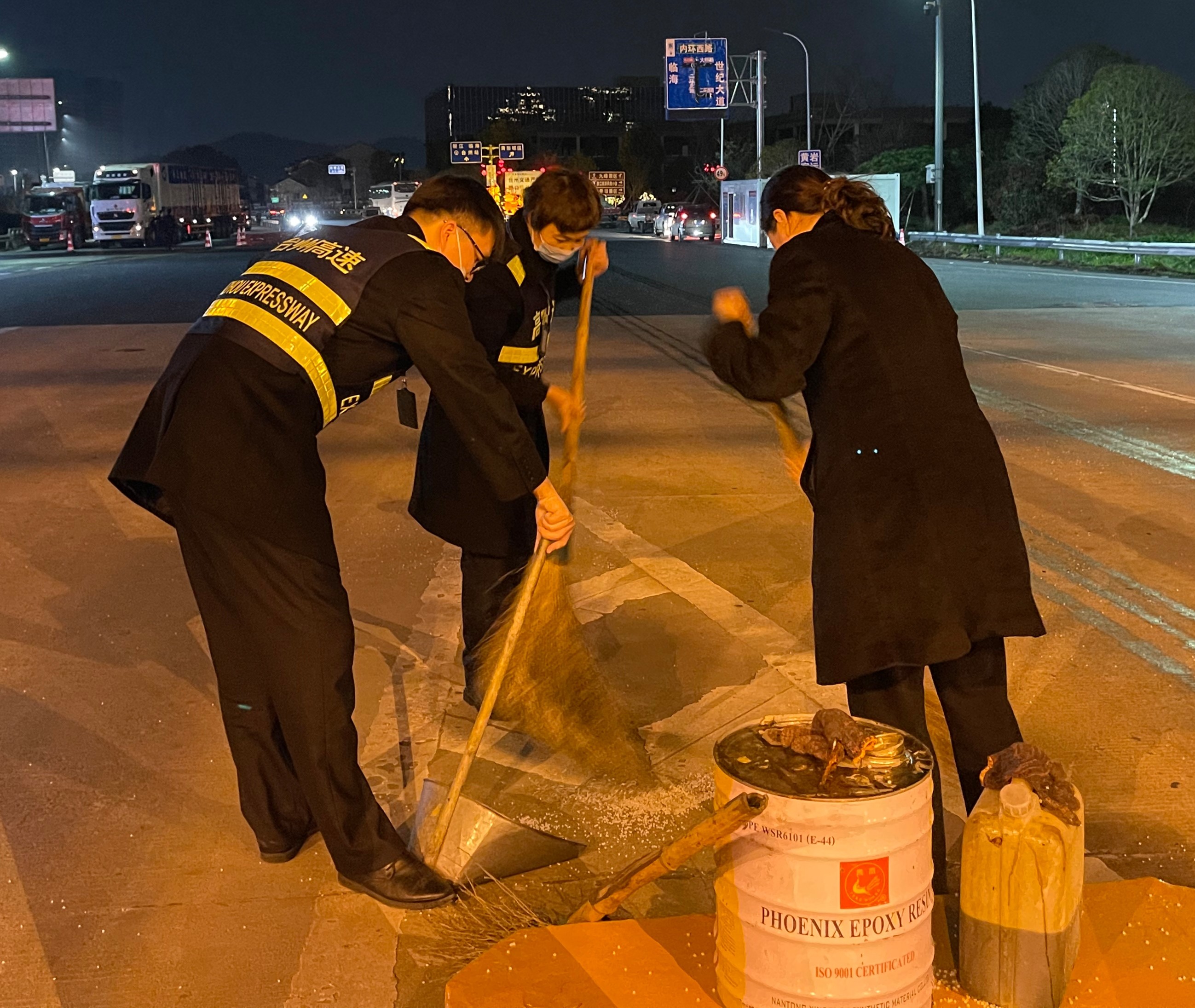 (圖為工作人員在清掃) 一時之間,車道路面上落滿大量的塑料顆粒,考慮到夜色已深,ETC車道上行駛的車輛速度大多很快,萬一司機沒有及時發現前方道路上的灑落物,極易造成輪胎打滑,嚴重影響行車安全。情況緊急,為了后續通行車輛的安全,收費班長立刻關閉了該ETC車道,并放置警示標志,然后將這一情況上報給監控中心和收費所值班人員。不等清潔人員到來,收費員羅時杰從車道的工具房拿出掃帚和簸箕,主動開始清掃工作。隨后其他不坐崗的收費員也投入到了清掃工作中,這支臨時清掃小隊在沒有任何人的領導下自發地組織起來。這時,從高速上完成機電養護工作的機電班工作人員正巧路過,他們看到這一幕立刻將車停靠在一邊,加入清掃隊伍。盡管散落的塑料顆粒數量較多,但在大家的共同努力下,車道終于被清理干凈,恢復了正常通車。 春日的夜晚微風拂過,已有春的暖意,而更暖的是這一幕在春夜里的一個個身影。大家因為一件小事而聚在一起,然而安全無小事。所有人心系安全,為所有過往車輛保暢保安全,為臺州高速貢獻自己的一份力。 崔翔浩 吳侃霓