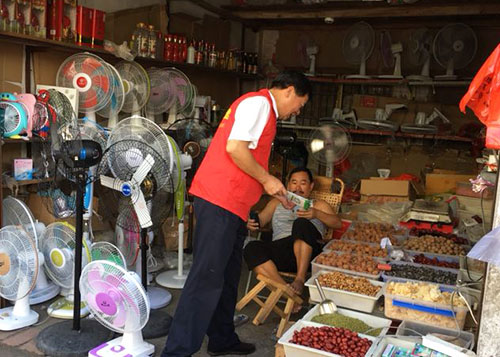 圖為志愿者向小商鋪店主宣傳垃圾分類