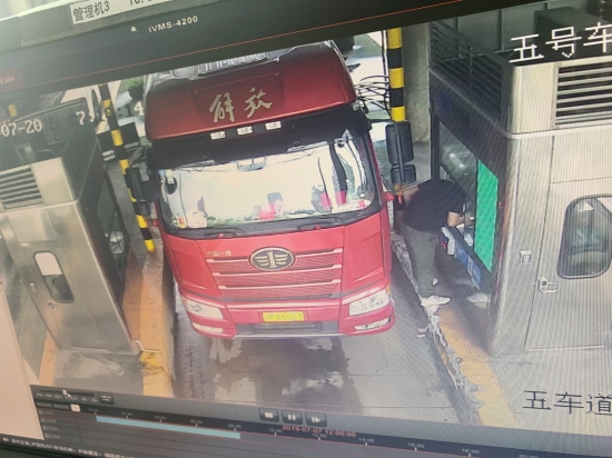 圖為失主遺落錢財現場 當天上午,收費班長李寧巡查時在第五車道窗口附近發現了三百元現金,經多方確定不是所內工作人員遺失后,判斷為過往司機不小心遺失。為了盡快找到失主,李寧隨即去監控室調取視頻查找。 經過監控查找,馬上鎖定了一輛車牌為“豫”字開頭的大貨車。原來當時因駕駛室距離窗口較遠,司機下車付錢,監控中清晰顯示司機在掏錢繳費時三百塊現金從口袋里掉到車道上,但是司機因為趕路絲毫沒有發覺。確認失主后,工作人員查詢司機電話并取得聯系,告知其遺失三百現金,在通過微信確認身份后,李寧將錢轉給了司機。