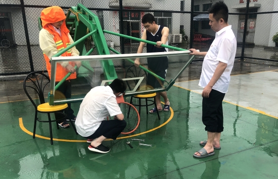 此前,溫嶺西已經做好基礎的抗臺防范工作,關閉所內各寢室、辦公室門窗,提前裝好沙袋備用,準備好抗臺物資及近幾天的餐食,確保所內各項事務正常運行。8月9日上午,該所長、副所長在臺風前做最后一次細致的排查,三人還親自動手將陽光房的窗戶都卸下來,避免風力太大,玻璃破裂,造成安全隱患。此外,為預防操場籃球架承受不住巨大風力,將籃球框拆卸下來,把籃球架放倒。其后通知所內開車的人員將所有車輛停入操場中,以防止周邊樹木被風刮斷,造成車輛損失。