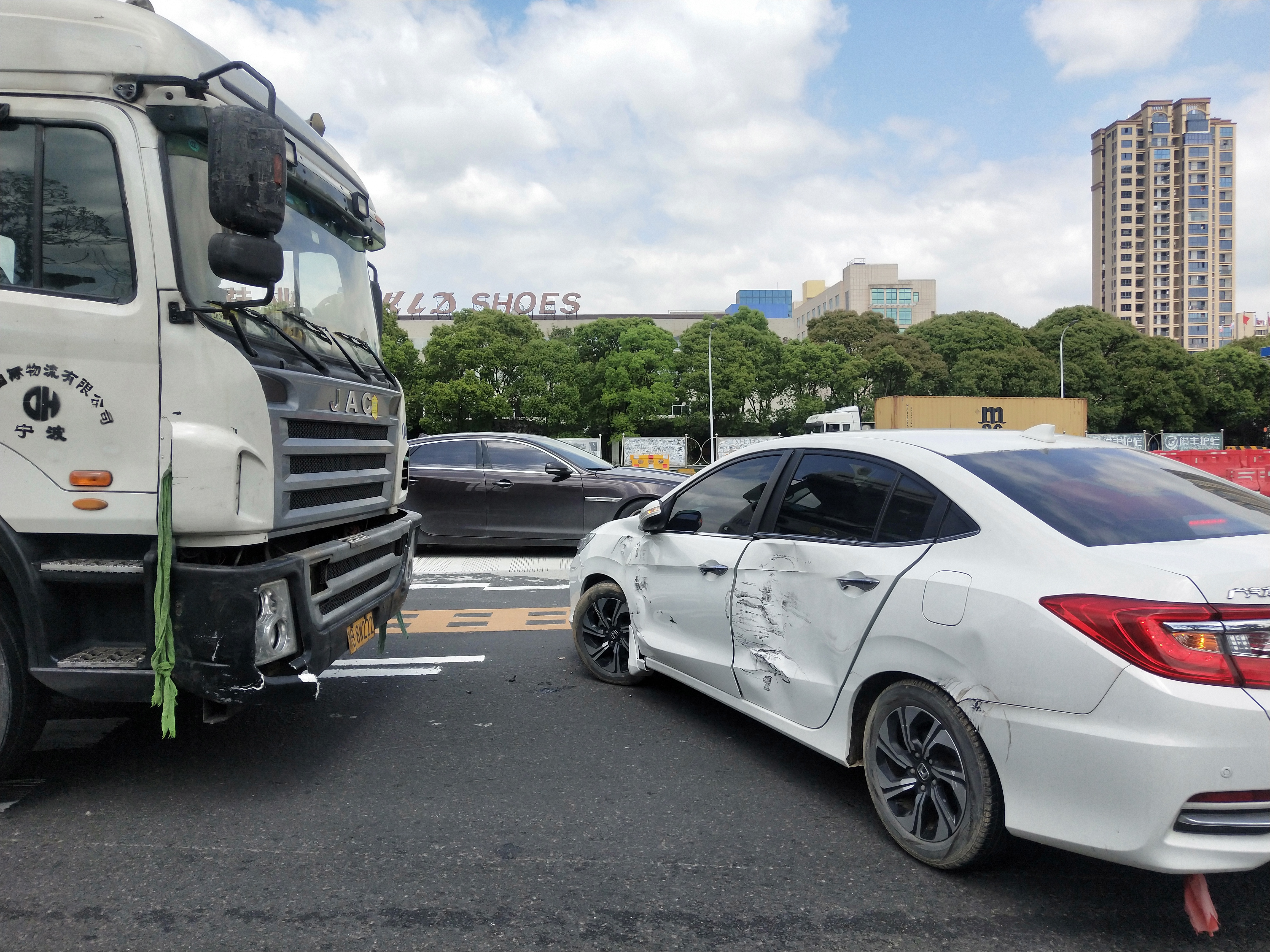 集裝箱收費站出口變道,兩車“親吻” |