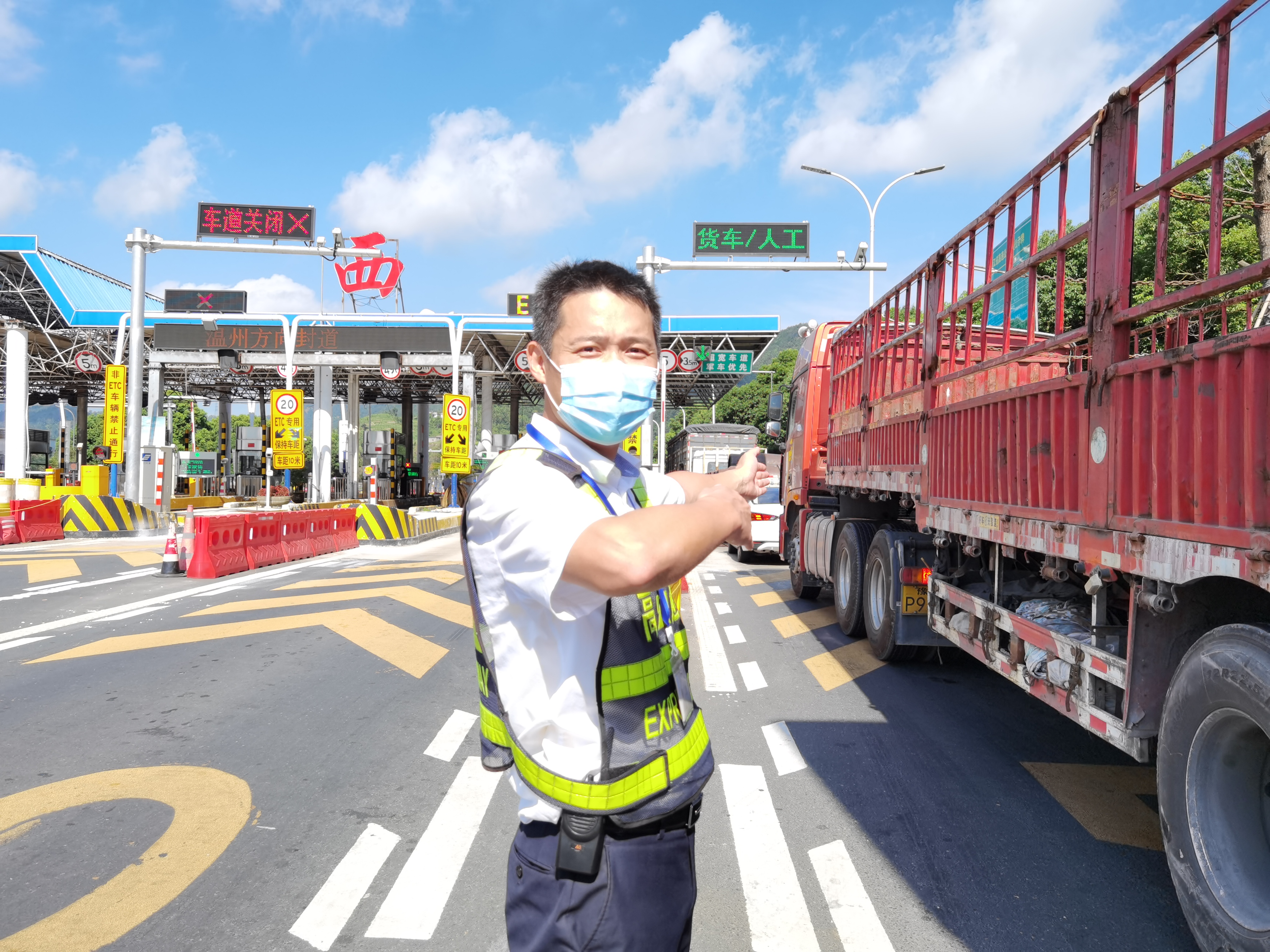 “師傅,慢點,注意后方來車,往左一點?!睖貛X西收費站入口處,一位身高一米七五左右的男同志正在維護著交通秩序。他就是征費三班班長李寧??崾罡邷責o法消磨他的斗志,揮汗如雨對他而言已是家常便飯。溫嶺西收費站車流量大,貨車多,當遇到三超車輛或者節假日的時候,入口處就會排成長龍。七八月份的太陽十分毒辣,經過一天的高溫,收費站入口的馬路上熱浪滾滾,人站在外面不到5分鐘就會汗流浹背。但為保持入口交通的安全暢通,李寧不斷做著各種不同的手勢,指揮著過往的車輛通行,絲毫顧不得擦拭順著臉頰流下來的汗水。他就是臺州高速上的最美堅守者。
