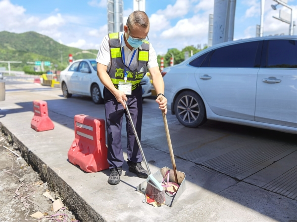 烈日灼燒著大地,高速兩邊的樹葉都被曬得打了卷,悶熱的空氣讓人喘不過氣來,在溫嶺西收費站,不少司乘人員在過站時,隨手將食品的塑料袋、煙頭、塑料瓶等垃圾丟棄在收費站出口處,班長陳軍見到隨時清掃路面,保持收費區域衛生干凈整潔。彎腰、清掃、起運,看似簡單的一組動作,陳軍每天要重復幾十次,衣服一天不知要被汗濕多少遍,但他堅持以良好的形象展示臺州高速的精神風貌。他就是臺州高速上的最美堅守者。