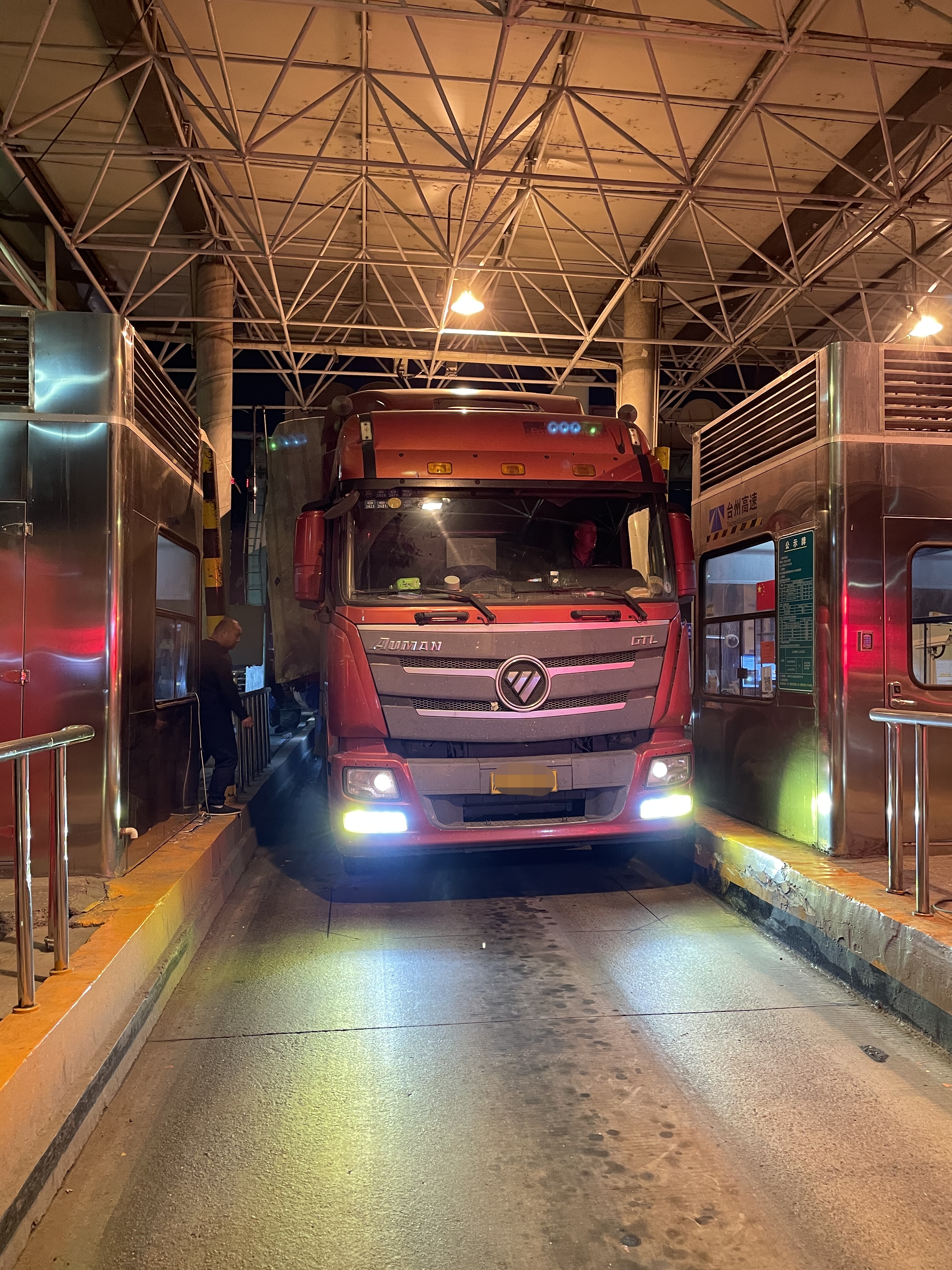 夜幕下的溫嶺西收費站入口,繁忙而有序,大貨車一輛接著一輛,對于超限車輛也在有序勸返當中。這時一輛運輸廢木板的車輛蓋著篷布飛快地駛入9號車道,不過該車已進入勸返人員的密切關注之,坐崗人員林華平也已做好了對該車勸返的準備。