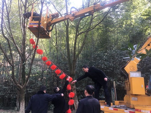 過年掛燈籠是中國古老習俗,紅色代表喜慶,圓形燈籠寓意團圓美滿。該所工作人員利用午休時間自制大紅燈籠750盞,并拿線連成串,大家借來登高車將燈籠掛在綠蔭道兩旁以及公路下方車輛經過的地方。遠觀這掛好的燈籠,一片紅火,形成春節期間一道亮麗的風景線。