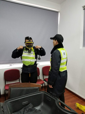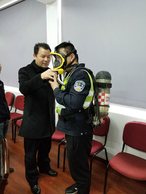 培訓(xùn)中,陶文輝講解了“高速隧道火災(zāi)特點(diǎn)”及呼吸器、防化服的使用方法及相關(guān)要求。話題開啟后,隊(duì)員們紛紛參與討論,爭相發(fā)言,講述各自在隧道事故處理中施救和應(yīng)對的經(jīng)歷與心得,交流平日巡查中所需注意的事項(xiàng),互相提醒工作中的不足,并針對實(shí)際問題提出了許多建設(shè)性意見。同時(shí),在主講人的現(xiàn)場演示下,參訓(xùn)人員逐個(gè)“以身試法”,進(jìn)一步熟悉和掌握了防毒面罩的穿戴方法。