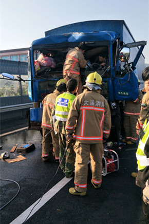 控制好現場以后,消防人員利用擴張器展開救援,但是成效并不明顯。7點左右,救護車已然到達現場,但是駕駛員依舊卡在車中。為保障駕駛員生命安全,消防人員并未進行強行拆除,而是召喚了一輛帶有氣泵設備的專業消防車趕往現場,利用氣泵剪進行破拆,經過眾人的努力,終于將臉上鮮血直流的駕駛員成功救出,并送上救護車。7點30分,救護車與消防人員撤離現場,施救中心人員進行善后工作,并將事故車輛拖離現場。8時許,高速恢復通行。