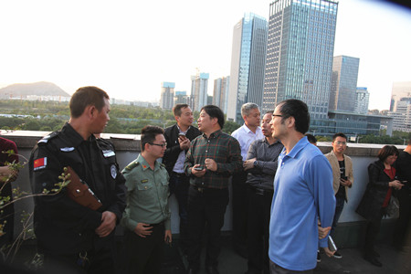 圖為演練前集團(tuán)安全總監(jiān)項(xiàng)同富介紹高層緩降逃生設(shè)備 培訓(xùn)結(jié)束后,參會(huì)人員集體到集團(tuán)大樓5樓外平臺(tái)觀摩高層緩降逃生演練。在演練中,2名模擬被困人員先后使用高層緩降逃生設(shè)備從16樓窗口平安緩降逃生到5樓平臺(tái)。之后通過(guò)演練和講評(píng),大家進(jìn)一步熟悉了高層緩降逃生設(shè)備及使用方法,拓展了高層建筑逃生思路。 陳科