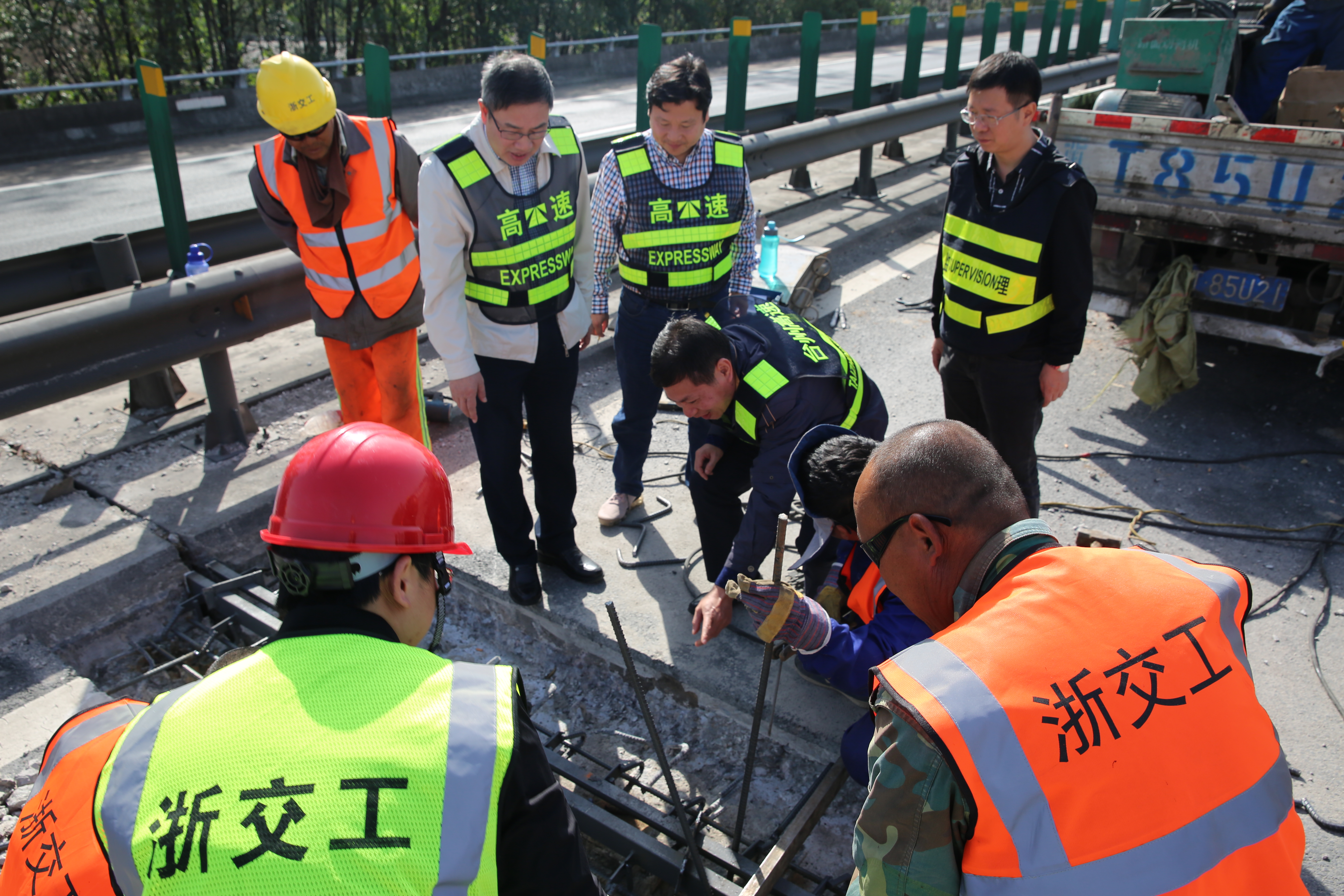 10月31日上午,臺州高速集團董事長陳文波在總工程師江輝的陪同下,趕赴甬臺溫高速公路溫州方向黃土嶺隧道、橋梁維修加固工程施工現場,檢查施工進展情況。