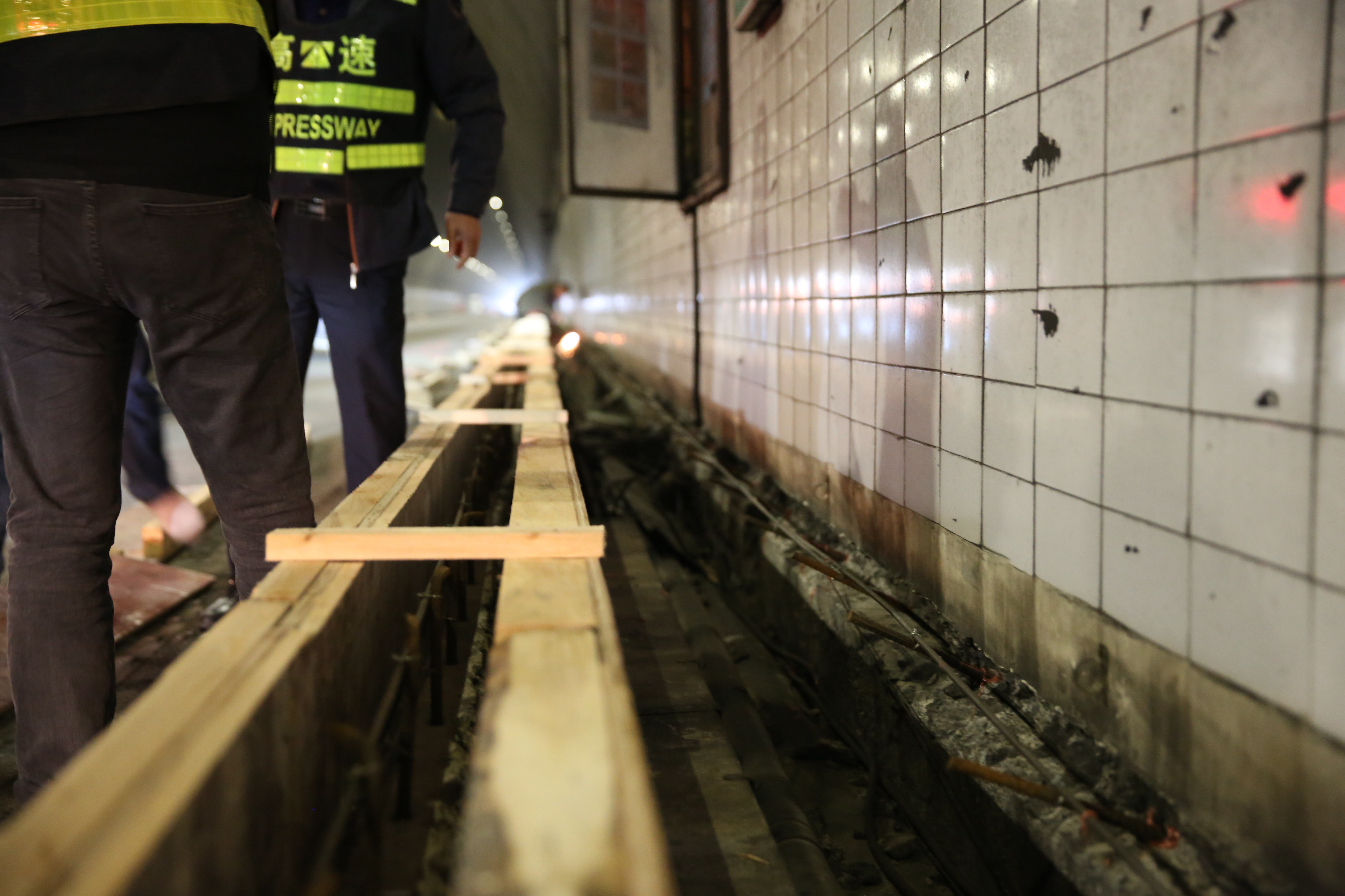 黃土嶺隧道原本設計邊溝高度25公分,目前車流量已超飽和狀態,極易發生事故,一旦事故發生,車輛容易騎上邊溝,撞擊隧道壁,存在重大安全隱患,現有邊溝設計高度已不能很好滿足安全運營需要。為了解決這個問題,此次隧道施工將抬高邊溝至40公分。施工現場,施工人員正在分成多組進行邊溝植筋立模。施工現場,多卷巨大的電纜線已經進場,施工人員正在分成多組進行邊溝植筋立模。