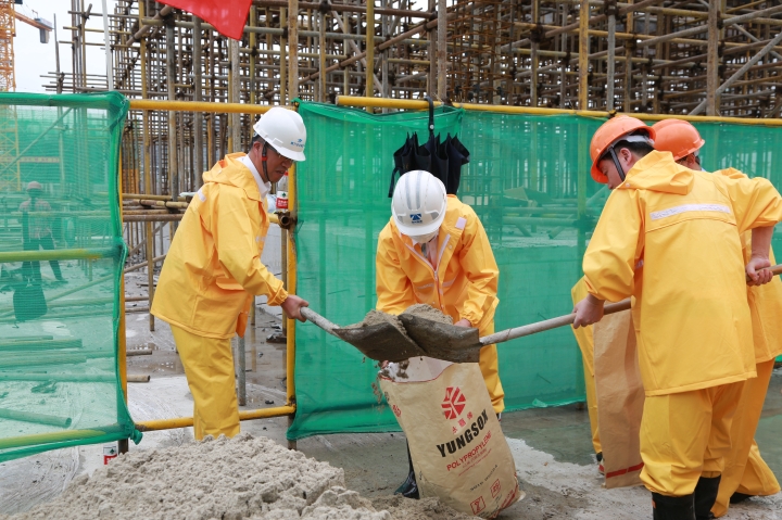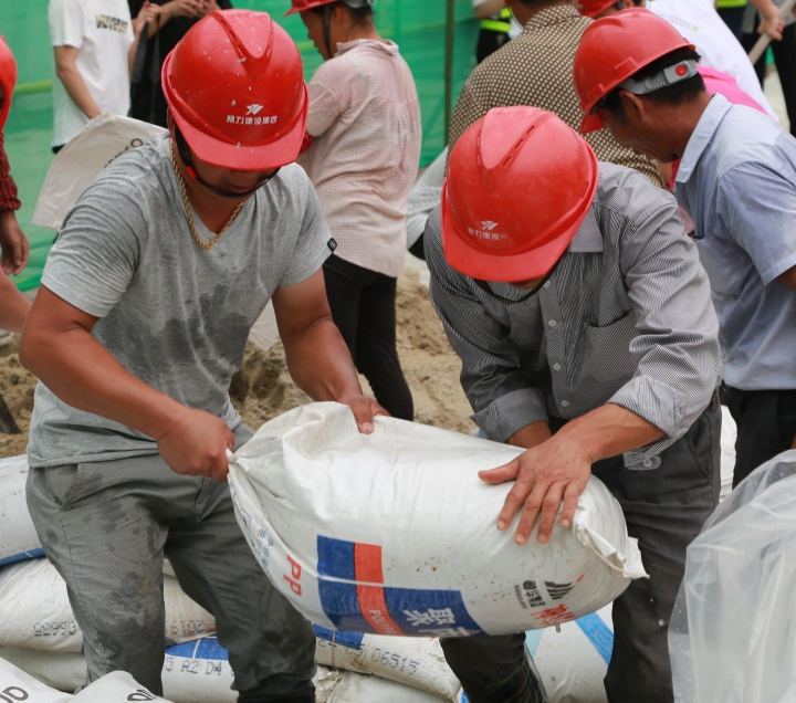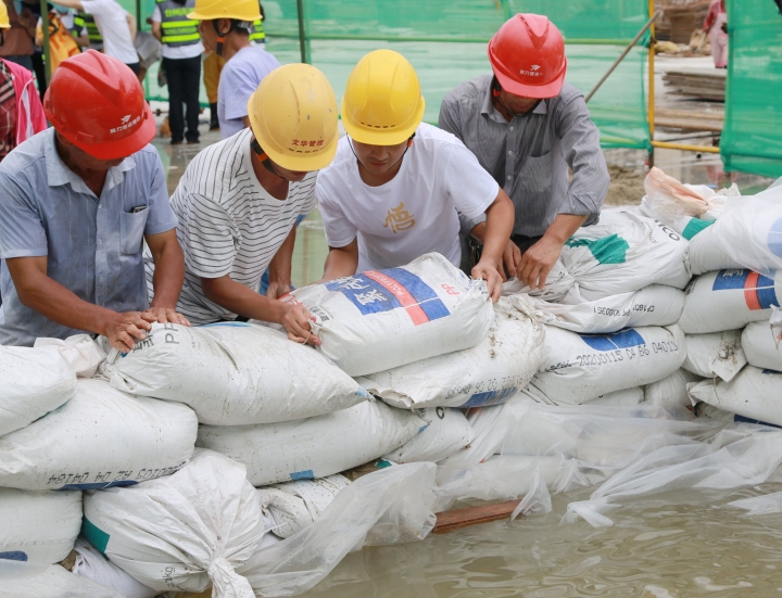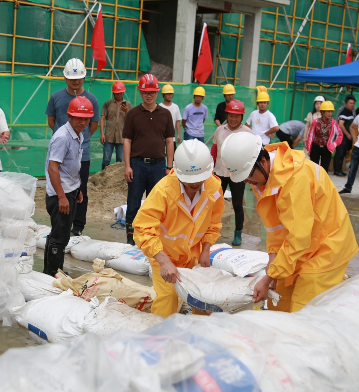 圖為模擬建筑工地面對(duì)洪水倒灌的現(xiàn)場應(yīng)急搶險(xiǎn)