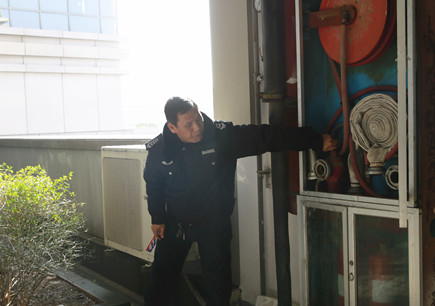 圖為安保部負責人在檢查滅火器