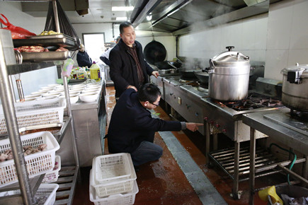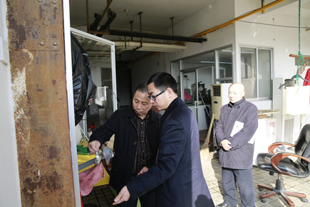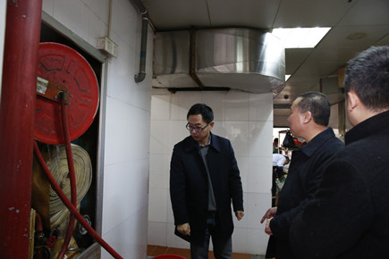 鑒于天臺縣足馨堂足浴中心2月5日發生的重大火災事故,2月6日一早,公司副總經理董阿林即刻組織安保部、辦公室相關人員對大樓進行消防安全大檢查。 “你們要多注意用電安全,及時清理生活區內的易燃物品至倉庫。”董阿林在檢查五樓食堂區域時對工作人員指出。
