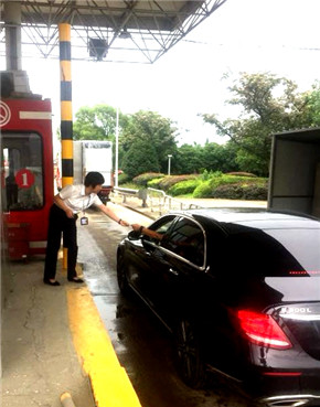 圖為一個崗亭同時承擔發卡和收費雙職能 信息就是命令,臺州南收費所第一時間將ETC切換成了人工收費模式。但是增加了一個車道仍是無法緩解這排山倒海之勢的車流量,最高峰時,該路段一度排起了約10公里的長龍,密密麻麻的車輛都在等著出站,保暢群里告急聲聲。臺州南收費所所長王益民坐不住了,一邊去電維養中心“能否將進口的一個車道改成出口車道?”,一邊帶領行政人員趕往副站協助分流。針對進口人工車道的電腦被收費程序占用,提前根據車型在通行卡上寫好類別,安排人員在車道上進行發放。不斷奔跑著發卡,數不清的來來回回,全心投入在保暢工作中的員工們竟不覺得乏累。同時,還特地在外廣場擺放友情提示牌,讓過往司乘可以多渠道提前了解通行信息。此情此景,不少過往司乘人員都不由地伸出了大拇指,為臺州高速創新的收費模式和貼心的文明服務點贊。