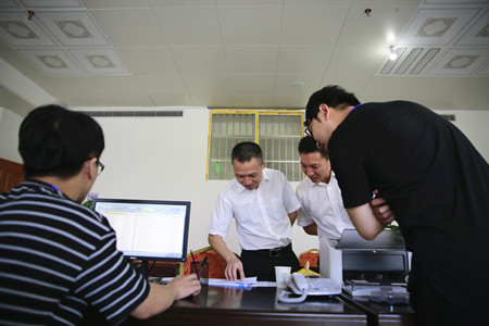 圖為集團副董事長、總經(jīng)理張建平在臨海股權(quán)收購點檢查工作人員業(yè)務操作