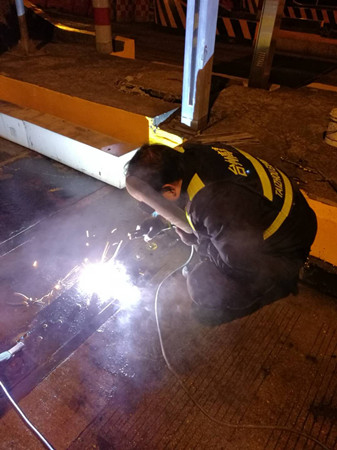 到了現(xiàn)場(chǎng),隊(duì)員發(fā)現(xiàn)該車道輪檢器鐵板螺孔由于不斷摩擦并逐漸變大,導(dǎo)致整顆螺栓脫離底下固定螺座,加之當(dāng)天是春節(jié)高速免費(fèi)第一天,車輛經(jīng)過時(shí)車速都較快,直接將整塊鐵板帶離底座。如果不及時(shí)對(duì)鐵板進(jìn)行加工恢復(fù),不僅不能保護(hù)下面的輪檢器,而且還有可能造成車輛爆胎。可除夕夜全部加工廠都已關(guān)門,如果讓廠家發(fā)貨至少也要好幾天。正在兩難之際,中心副經(jīng)理葉俊想到將鐵板與底座邊緣直接焊死的臨時(shí)應(yīng)急方法,待節(jié)后再向廠家定制或重新購買。 方案有了,大家兵分兩組,一組去中心倉庫拿電焊機(jī)、電焊條等設(shè)備,一組待在原地清理鐵底下方於泥等雜物,為隨后的電焊工作做準(zhǔn)備。設(shè)備到位后,葉俊一手操起電焊罩,一手熟練的將電焊條點(diǎn)在了鐵板與底座邊緣之間,經(jīng)過近一個(gè)小時(shí)的處理,輪檢鐵板與地面底座牢牢地固定在一起,再也不用被飛馳而過的車輛帶離。 項(xiàng)寅曉