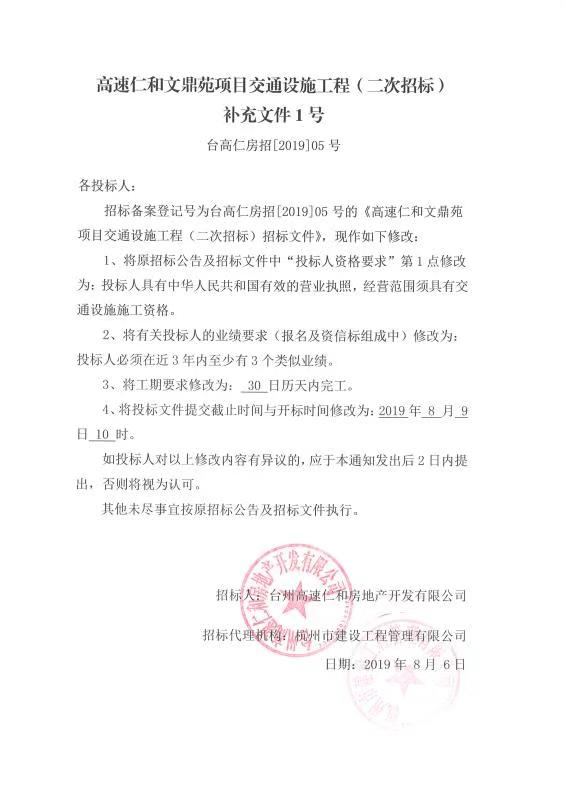 高速仁和文鼎苑項目交通設(shè)施工程(二次招標)補充文件1號