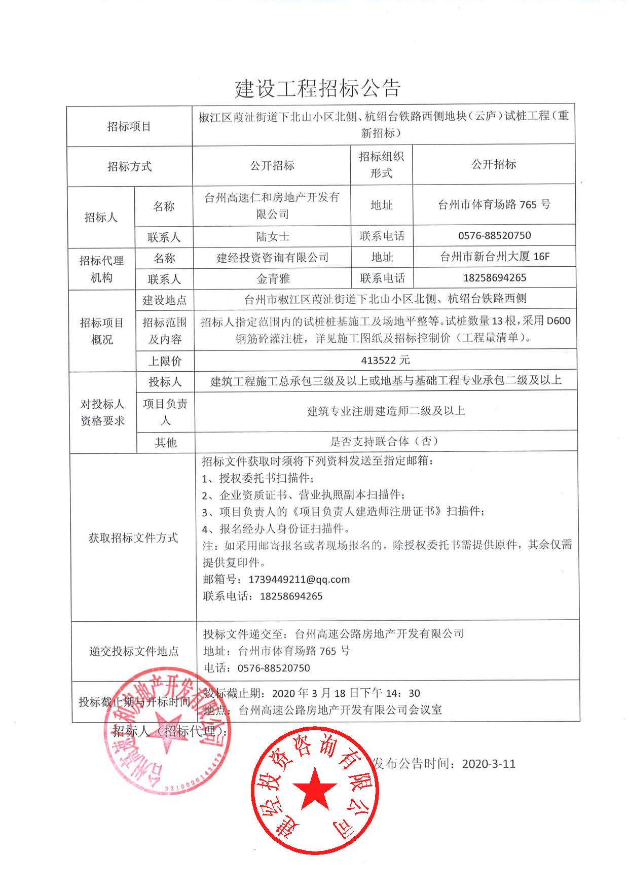 椒江區(qū)葭沚街道下北山小區(qū)北側(cè)、杭紹臺鐵路西側(cè)地塊(云廬)試樁工程(重新招標(biāo))公告