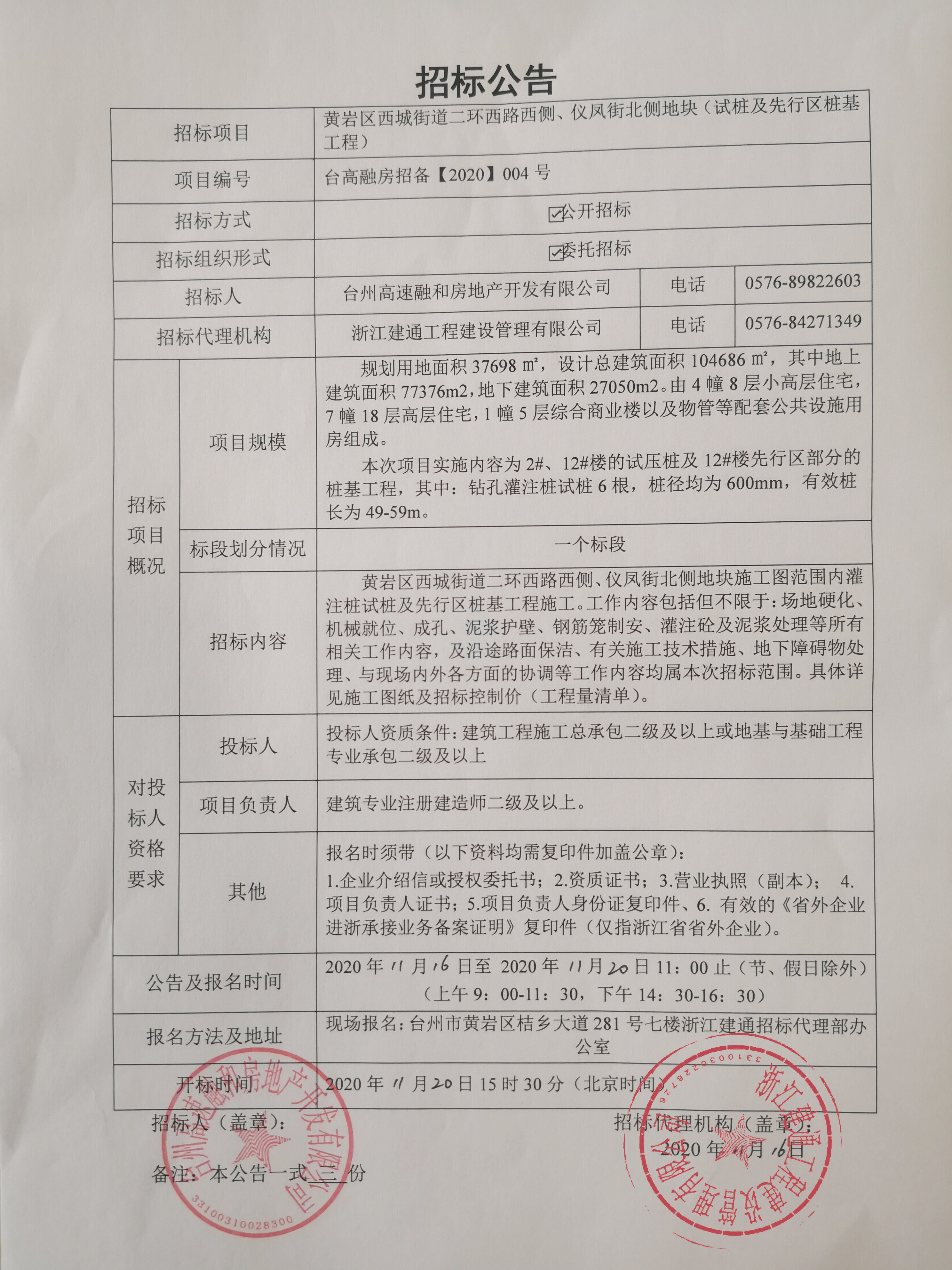 黃巖區(qū)西城街道二環(huán)西路西側(cè)、儀鳳街北側(cè)地塊(試樁及先行區(qū)樁基工程)招標(biāo)公告