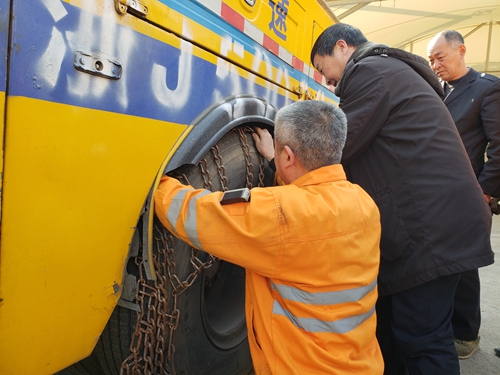 圖為捆綁好的防滑鏈 輪胎捆綁防滑鏈?zhǔn)擒囕v行駛在冰天雪地中增加輪胎對路面的摩擦力,以防止打滑的一項(xiàng)安全措施。雖然在南方這樣的氣候很少見,在實(shí)際工作中也較少遇到,但是施救中心每年都會開展相關(guān)的操作演練,并且要求全體員工務(wù)必熟練操作,此是安全預(yù)防的重要工作之一。