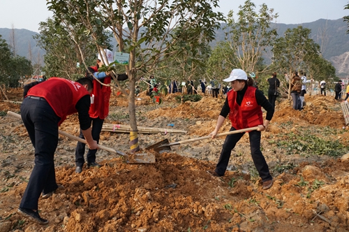 圖為植樹現場 由于此次栽種的樹苗偏大,大家分組合栽樹苗,腳踏泥濘,挖坑、下樹苗、填土、澆水……栽種現場氣氛熱鬧,雖然一身泥巴,大家卻樂此不疲。在近一個小時的共同努力下,分配的樹苗栽植完成,大家還為自己植的樹掛上“樹木領養卡”,在栽種好的樹苗前合影留念,為自己種的樹賦予更多的意義。