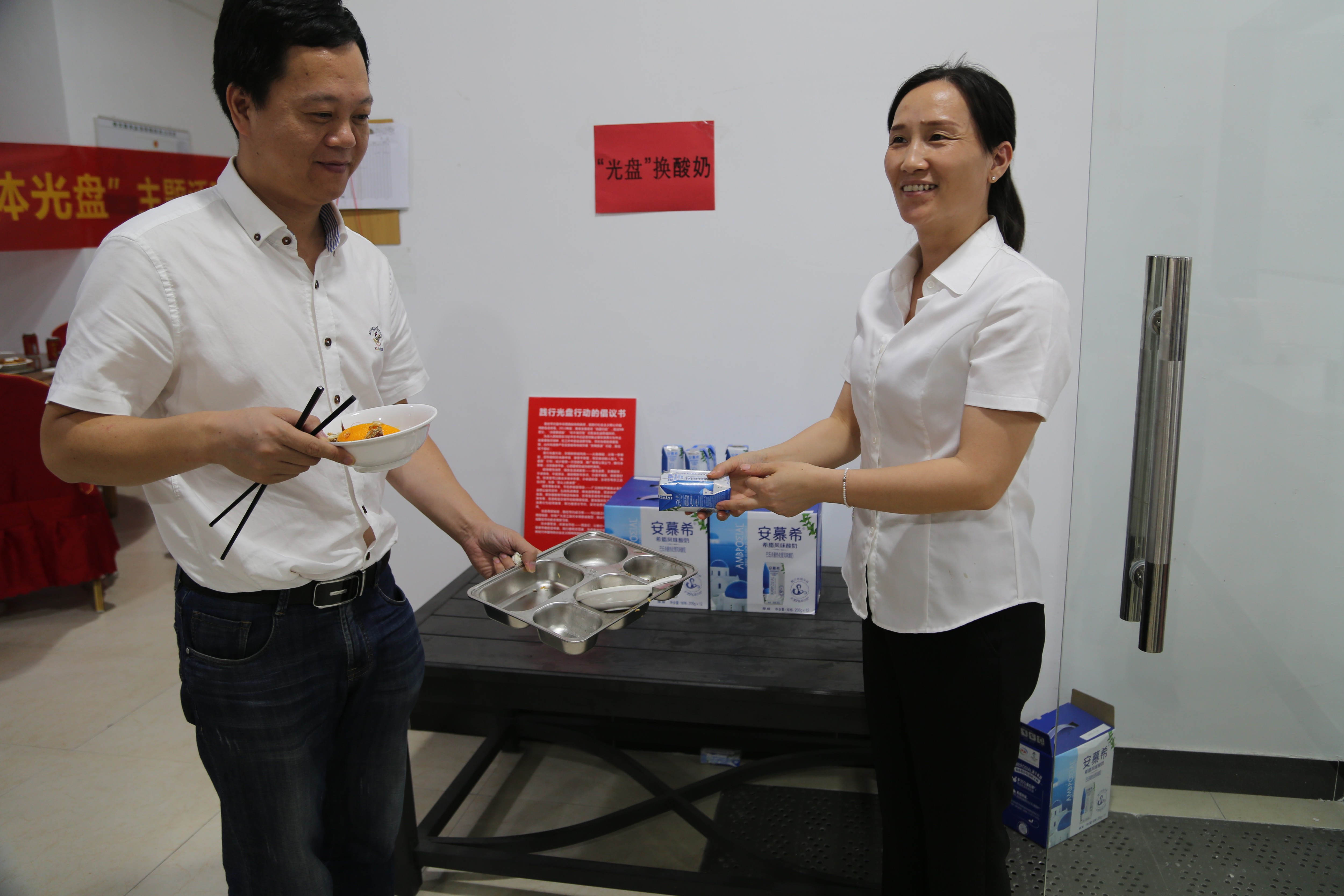餐后,公司為倡導員工愛惜糧食,鼓勵員工積極光盤,實行“光盤獎勵”,每一位員工憑光盤可以兌換酸奶一瓶,借此小獎勵,倡導文明新風尚,以“光盤”為榮,以“剩宴”為恥。