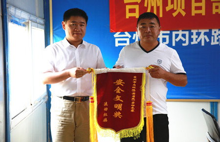 圖為為獲獎施工單位頒發流動紅旗