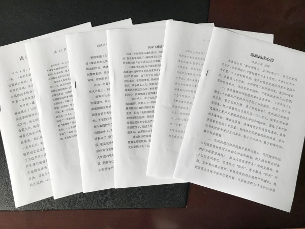 圖為勤政廉政讀書心得 早在年初,市政公司每一位員工簽訂了《廉潔履職個人承諾書》,這個月新到的兩名員工剛進公司第一天即簽訂了這份承諾書。